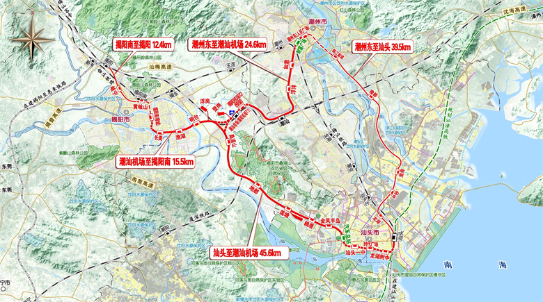 粵東城際鐵路位于廣東省粵東地區(qū),連接汕頭、揭陽、潮州三市,近期實(shí)施汕頭至潮汕機(jī)場段、潮州東至潮汕機(jī)場段、潮汕機(jī)場至揭陽南段及潮州東至汕頭段共4個(gè)項(xiàng)目,線路全長約123.16km。其中,汕頭至潮汕機(jī)場段正線全長約41.76km。潮州東至潮汕機(jī)場段線路全長約24.05km。潮汕機(jī)場至揭陽南段線路全長約16.10km。潮州東至汕頭段線路全長約41.25km。